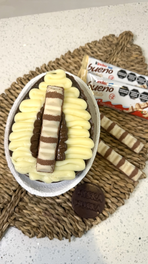 Huevo de chocolate con leche relleno de crema kinder decorado con kinder bueno