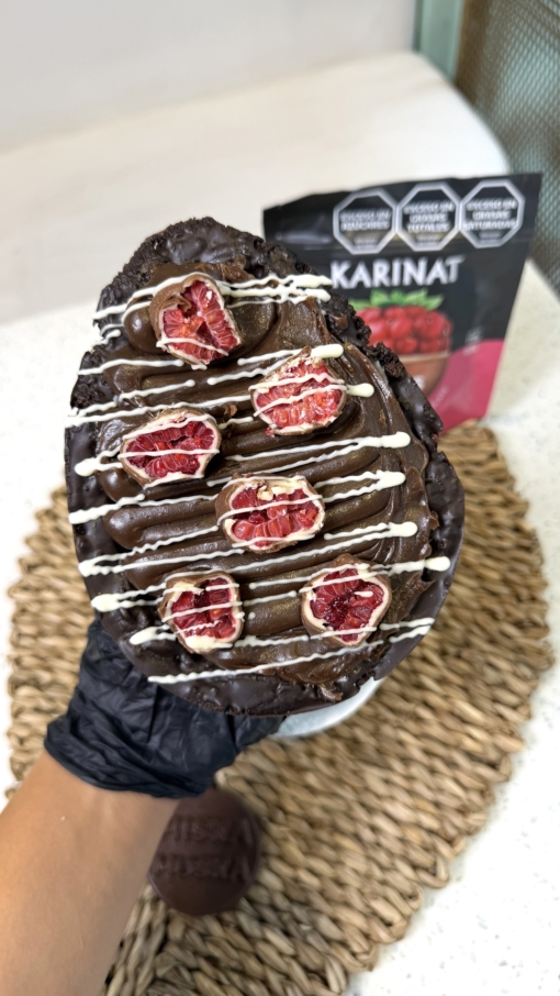 La base de este huevo es de brownie. Relleno de dulce de leche, crema de frutos rojos, crema bariloche y franui