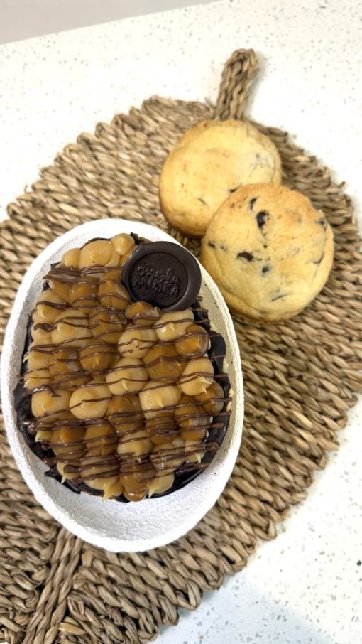 La base de este huevo es de cookie. Relleno de caramelo, crema chantilly, con hilos de chocolate. Para los fanáticos de nuestras cookies.