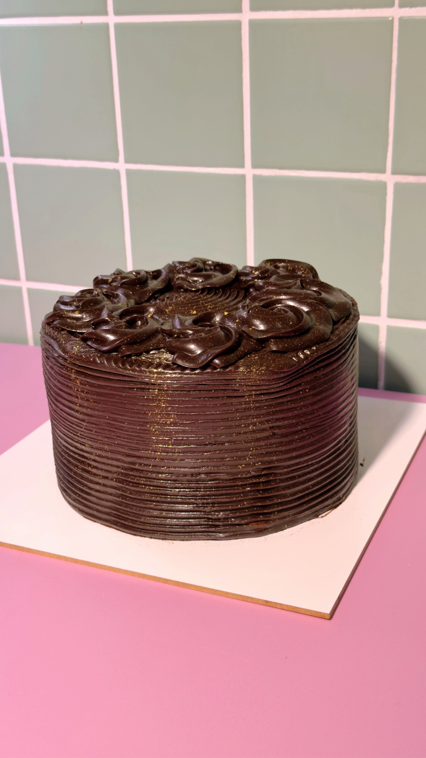 Bizcochuelo extra húmedo de chocolate relleno con crema bariloche (dulce de leche y chocolate).