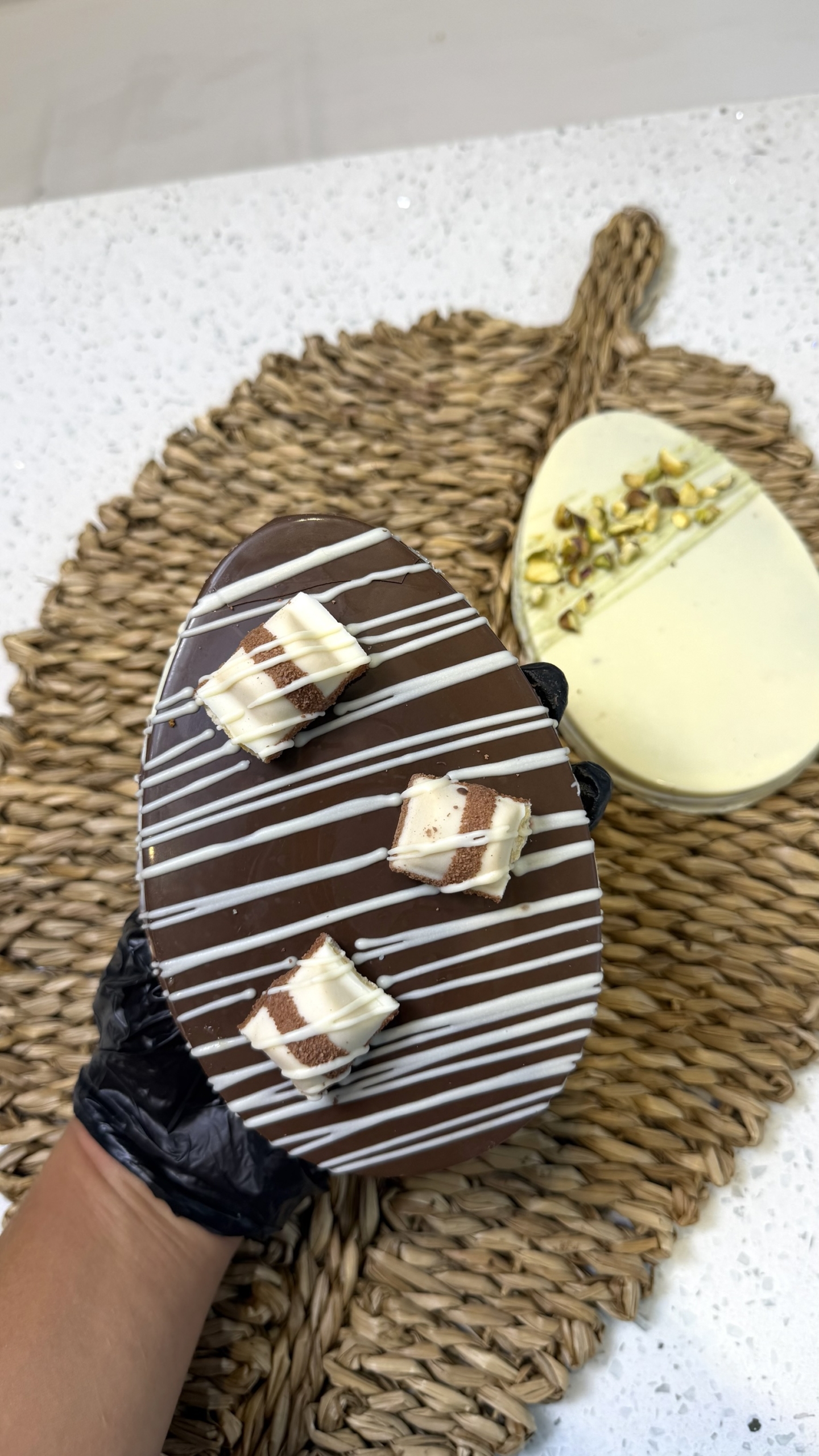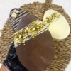 Huevo de chocolate con leche relleno de crema kinder decorado con kinder bueno