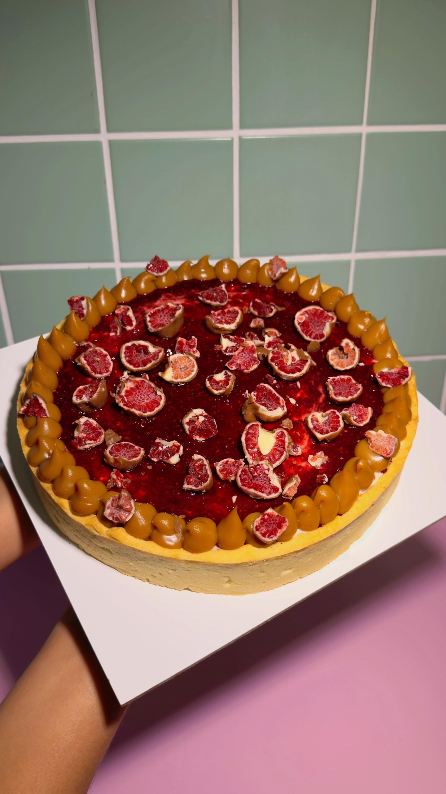 Tarta rellena de dulce de leche, reducción de frambuesas, chocolate y