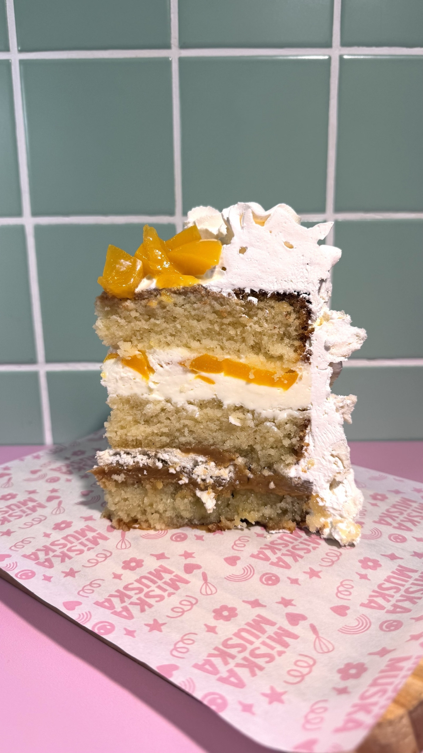 Bizcochuelo húmedo de vainilla relleno de dulce de leche y crema chantilly con duraznos. Rinde 20 porciones